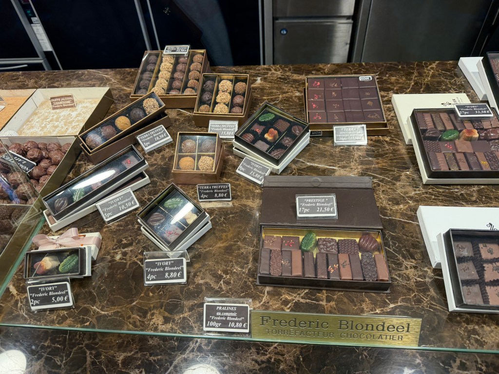 Our first full day was spent wandering the shops and markets of city center. We started the day at one of the lovely little cafes; stopped into Aux Merveilleux for a lovely sandwich and my new obsession, brioche with chocolate; and ended the evening at a highly recommended fish place, Bia Mara. All were outstanding! Brussels is living up to its reputation as a food town!